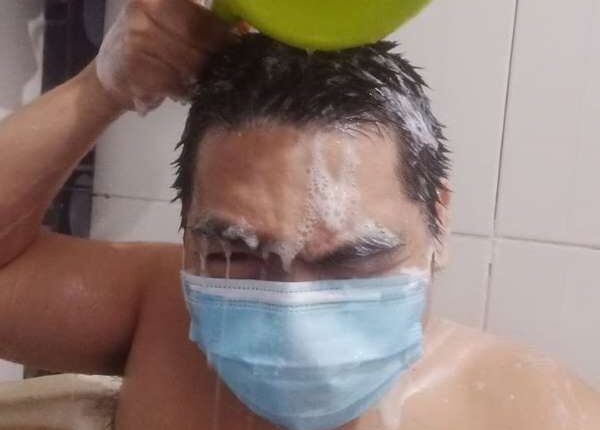 Sa kanyang social media post, kita nga na sinunod ng lalaki ang payo ng gobyerno na magsuot ng face mask kahit nasa loob ng bahay. Kahit sa kanyang paliligo ay suot niya ang face mask.