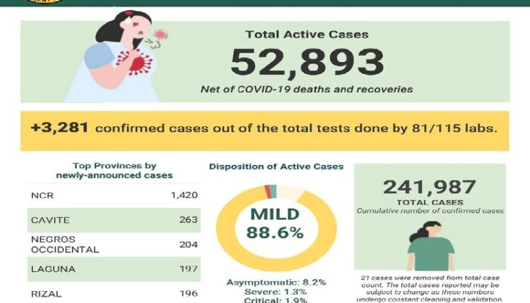 Ayon sa DOH, sa ngayon ay nasa 52,893 pa ang itinuturing nilang active cases ng COVID-19 sa bansa kung saan 88.6% ang mild cases; 8.2% ang asymptomatic; 1.3% ang severe cases at 1.9% naman ang critical cases.