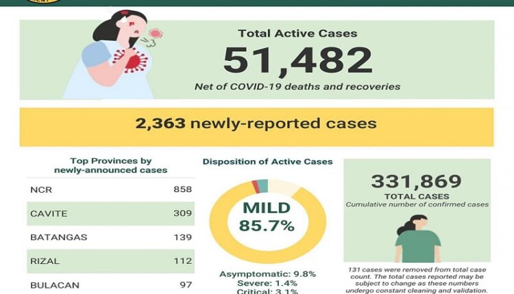 UMAKYAT na sa 331,869 ang kabuuang bilang ng mga kaso ng covid-19 sa bansa matapos makapagtala ang Department of Health (DOH) ng bagong 2,363 infection kahapon, base sa pinakahuling ulat ganap na alas-4 ng hapon nitong Huwebes, Oktubre 8.