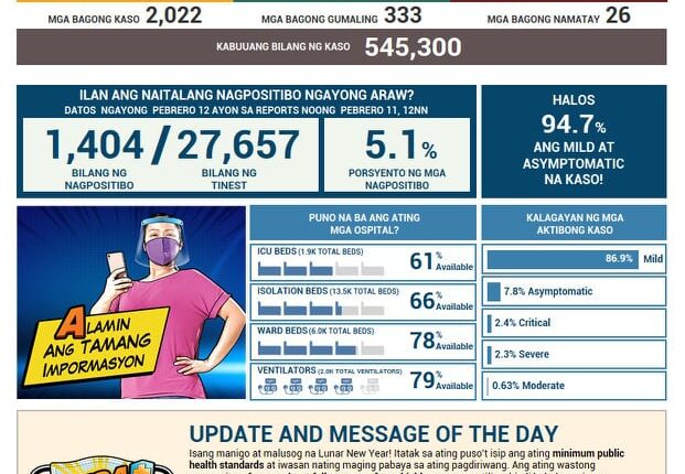 NAKAPAGTALA ang Department of Health (DOH) ng karagdagang 2,022 kaso ng Covid-19 nitong Biyernes, Pebrero 12.