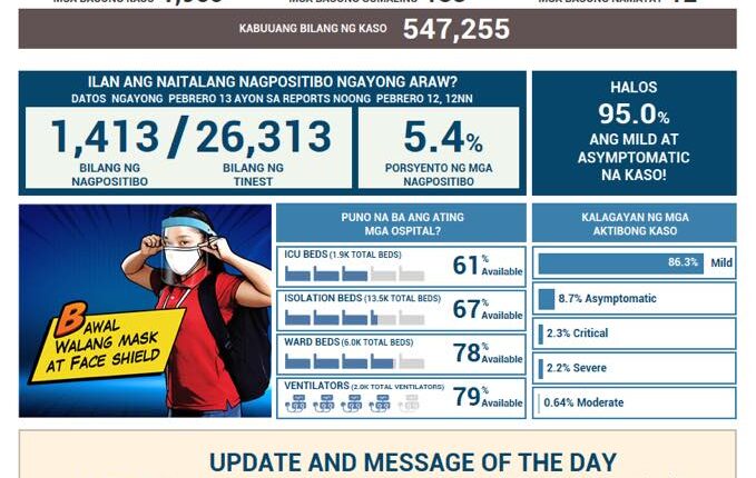 NAKAPAGTALA pa ng 1,960 na bagong kaso ang Covid-19 sa bansa dahilan para umakyat na sa kabuuang bilang na 547,255 ang nagpositibo sa nakamamatay na sakit batay sa case bulletin update ng Department of Health ngayong Sabado, Pebrero 13.