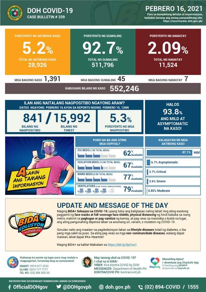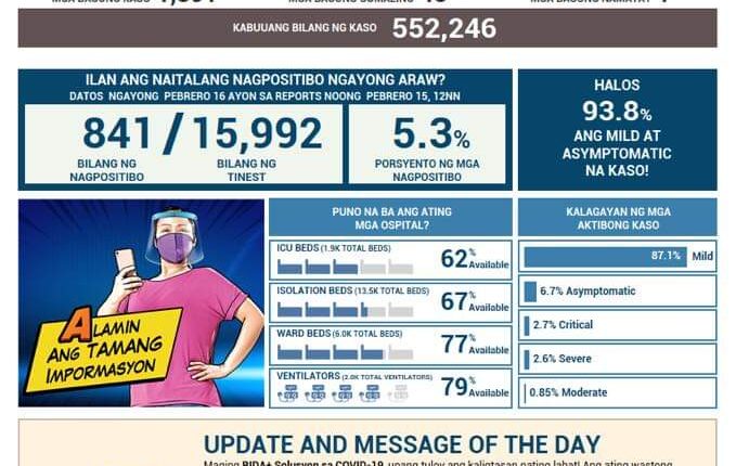 LUMOBO pa ang kaso ng COVID-19 sa bansa matapos makapagtala ng 1,391 bagong kaso ang Department of Health (DOH) ngayong Martes, Pebrero 16.