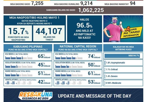 Kaugnay nito, bumaba ng bahagya ang naitalang karagdagang kaso ng COVID-19 ng Department of Health (DOH) nang ito ay makapagtala ng 7,255 nitong Lunes, Mayo 3.