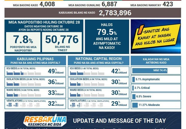 NAKAPAGTALA pa ang Department of Health (DOH) ng 4,008 bagong kaso ng COVID-19 sa bansa nitong Sabado habang pumalo na sa mahigit 43,000 ang bilang ng mga namatay dahil sa virus matapos na makapagtala pa ng 423 hanggang nitong Oktubre 30.