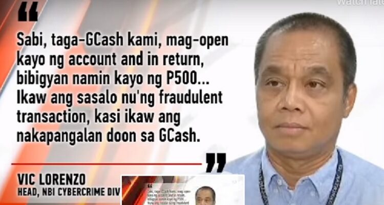 “Sabi [may magpapakilala], tiga-GCash kami, mag-open kayo ng account and in return, bibigyan namin kayo ng P500… Ikaw ang sasalo noong fraudulent transaction kasi ikaw ang nakapangalan doon sa GCash,” babala ni NBI Cybercrime Division head Vic Lorenzo.