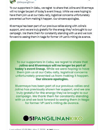 Inanunsiyo na ng kampo ng dating senator na hindi makakasipot sa pa-concert sina Jolina Magdangal at Rivermaya dahil sa hindi inaasahang kadahilanan.