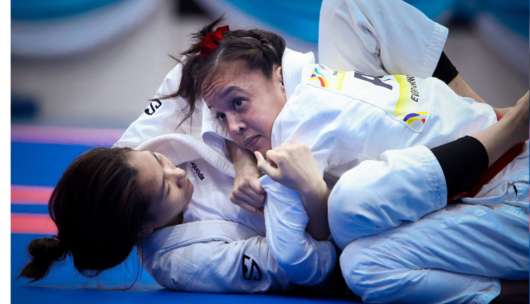 Ipinakita nina Kimberly Custodio at Dean Roxas ang kanilang klase sa jiu-jitsu ne-waza na kaganapan sa ika-33 na Southeast Asian Games sa Ronnaphakat Building, Navaminda Kasatiryahiraj Air Force Academy noong Huwebes.