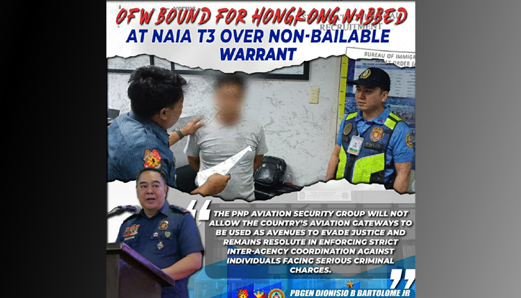 Nanawagan ang immigration officer sa NAIA Police Station 3 (NPS 3) para sa isang beripikasyon at naaangkop na aksyon dahil ang suspek ay may nakabinbin na ‘arrest warrant’ sa issuing court.